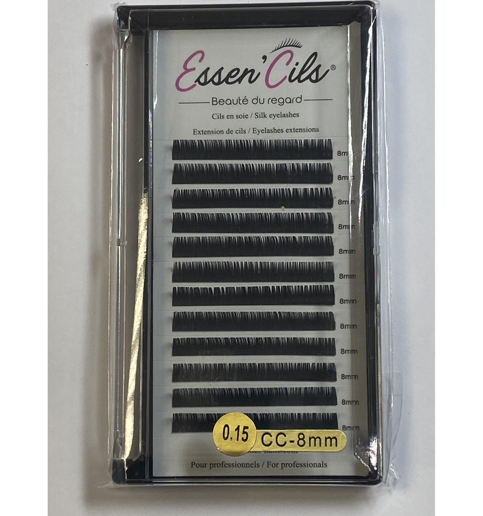 Extension de cils Essen'cils soie Boite de 12 Bandes de cils en 8 mm Courbure en CC Epaisseur de 0.15 Pour réaliser vos poses d'extension de cils en soie avec la technique du cil à cil. Résistantes, souples et confortables.