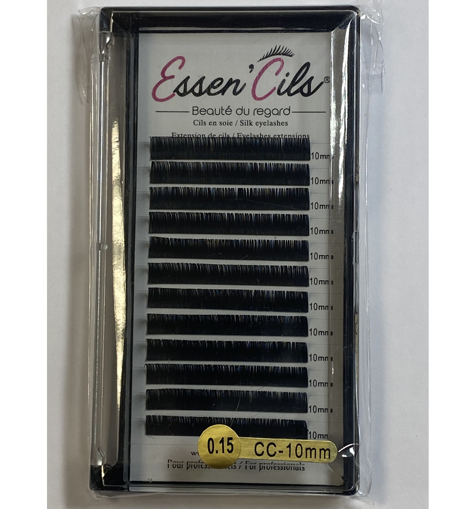 Extension de cils Essen'cils soie Boite de 12 Bandes de cils en 10 mm Courbure en CC Epaisseur de 0.15 Pour réaliser vos poses d'extension de cils en soie avec la technique du cil à cil. Résistantes, souples et confortables.