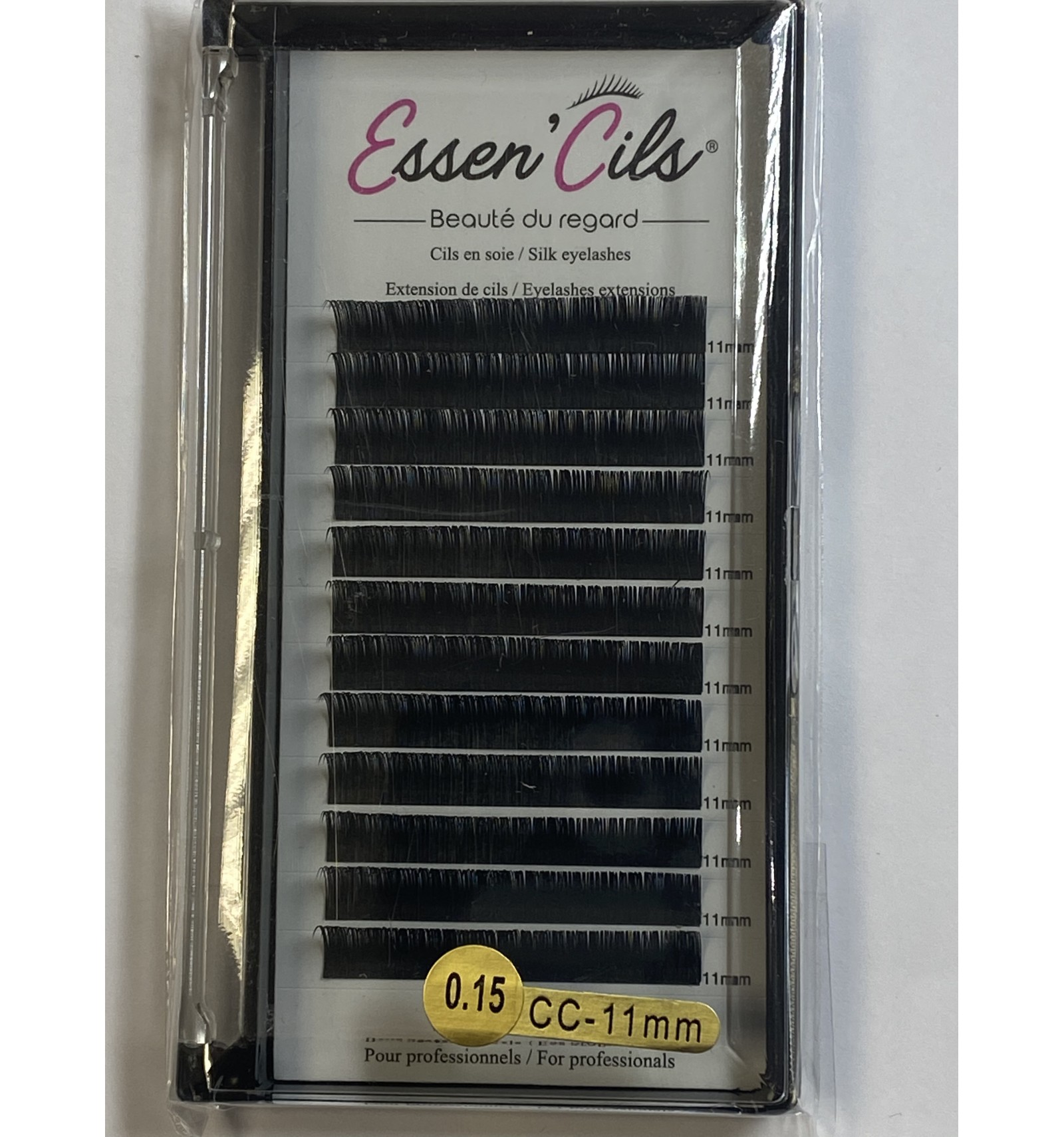 Extension de cils Essen'cils soie Boite de 12 Bandes de cils en 11 mm Courbure en CC Epaisseur de 0.15 Pour réaliser vos poses d'extension de cils en soie avec la technique du cil à cil. Résistantes, souples et confortables.