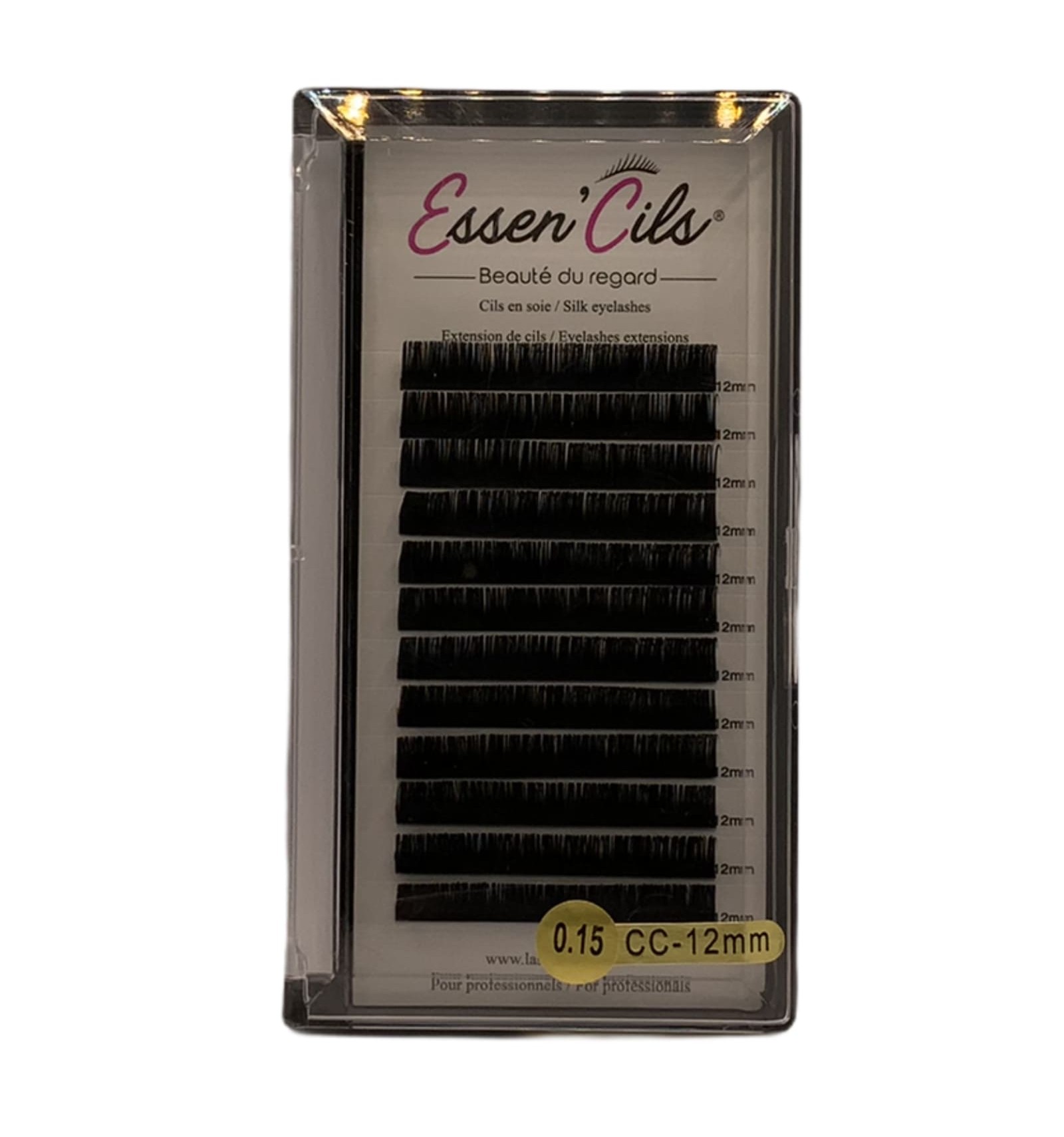 Extension de cils Essen'cils soie Boite de 12 Bandes de cils en 12 mm Courbure en CC Epaisseur de 0.15 Pour réaliser vos poses d'extension de cils en soie avec la technique du cil à cil. Résistantes, souples et confortables.