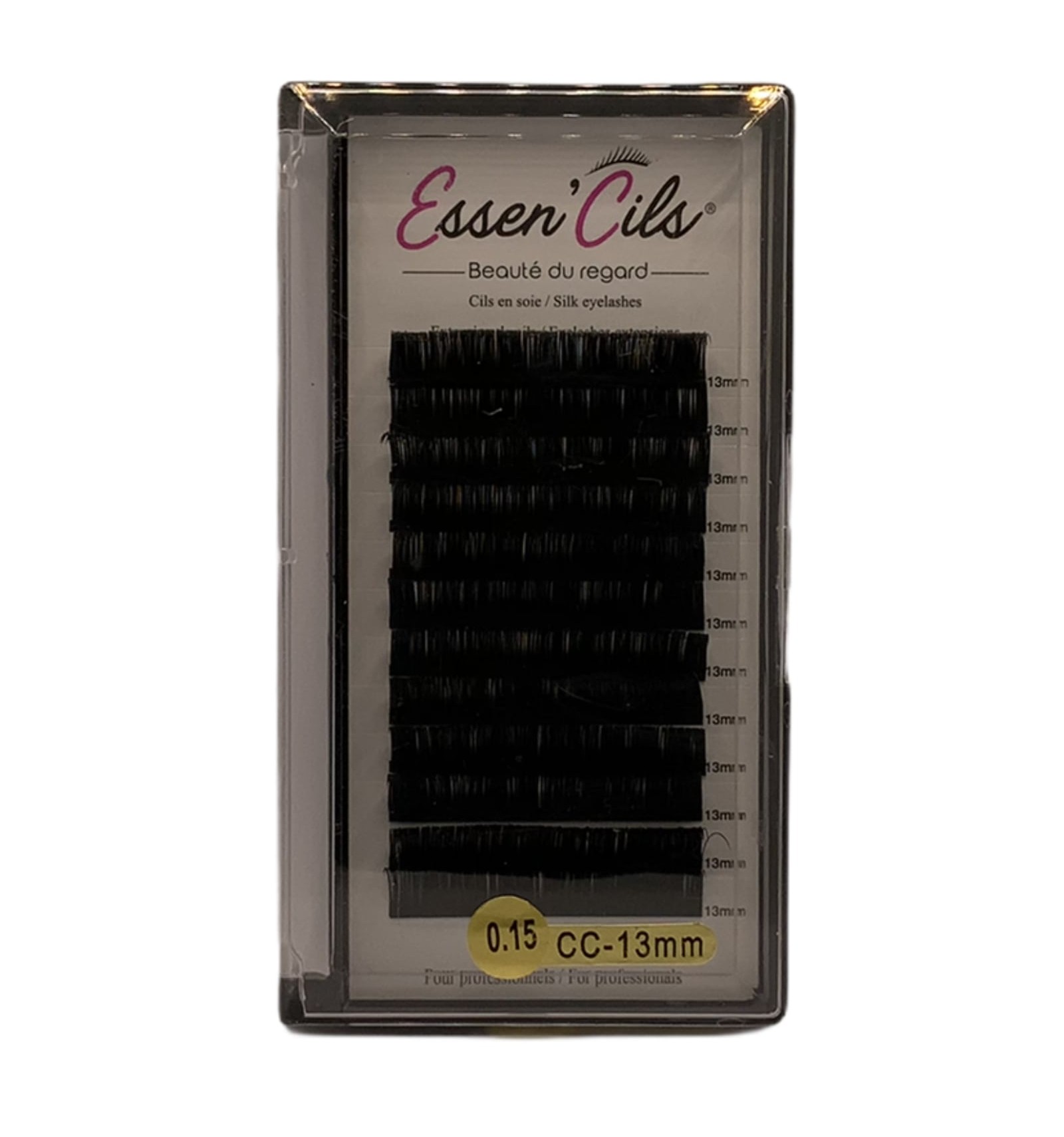 Extension de cils Essen'cils soie Boite de 12 Bandes de cils en 13 mm Courbure en CC Epaisseur de 0.15 Pour réaliser vos poses d'extension de cils en soie avec la technique du cil à cil. Résistantes, souples et confortables.
