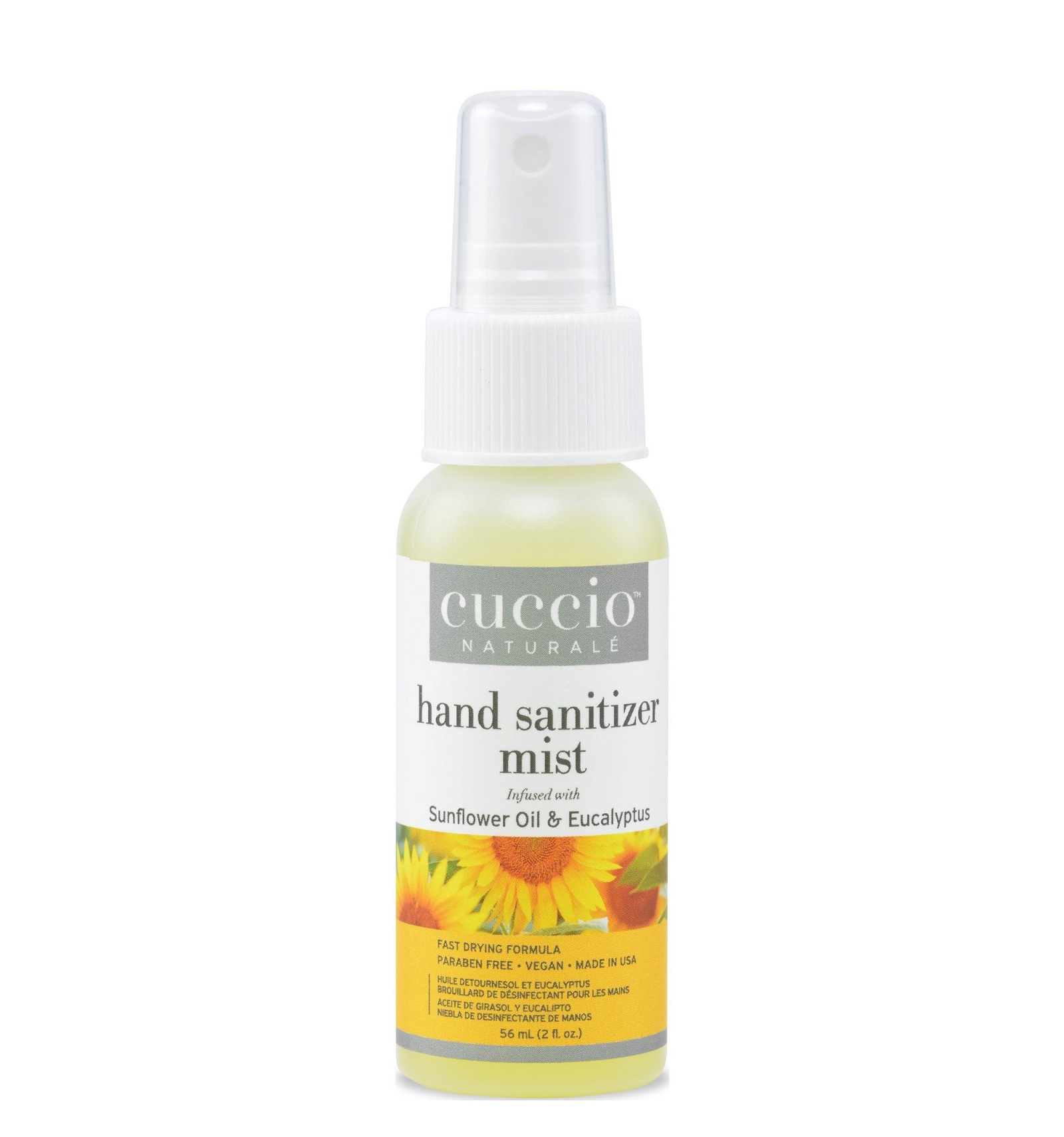 Spray désinfectant pour les mains au tournesol et eucalyptus. Utilisez sur les mains pour aider à réduire les bactéries présentes sur vos mains. Le vaporisateur à brouillard sèche rapidement, sans paraben et convient aux végétaliens. Pas besoin de rincer après. Non testé sur les animaux. 56 ml