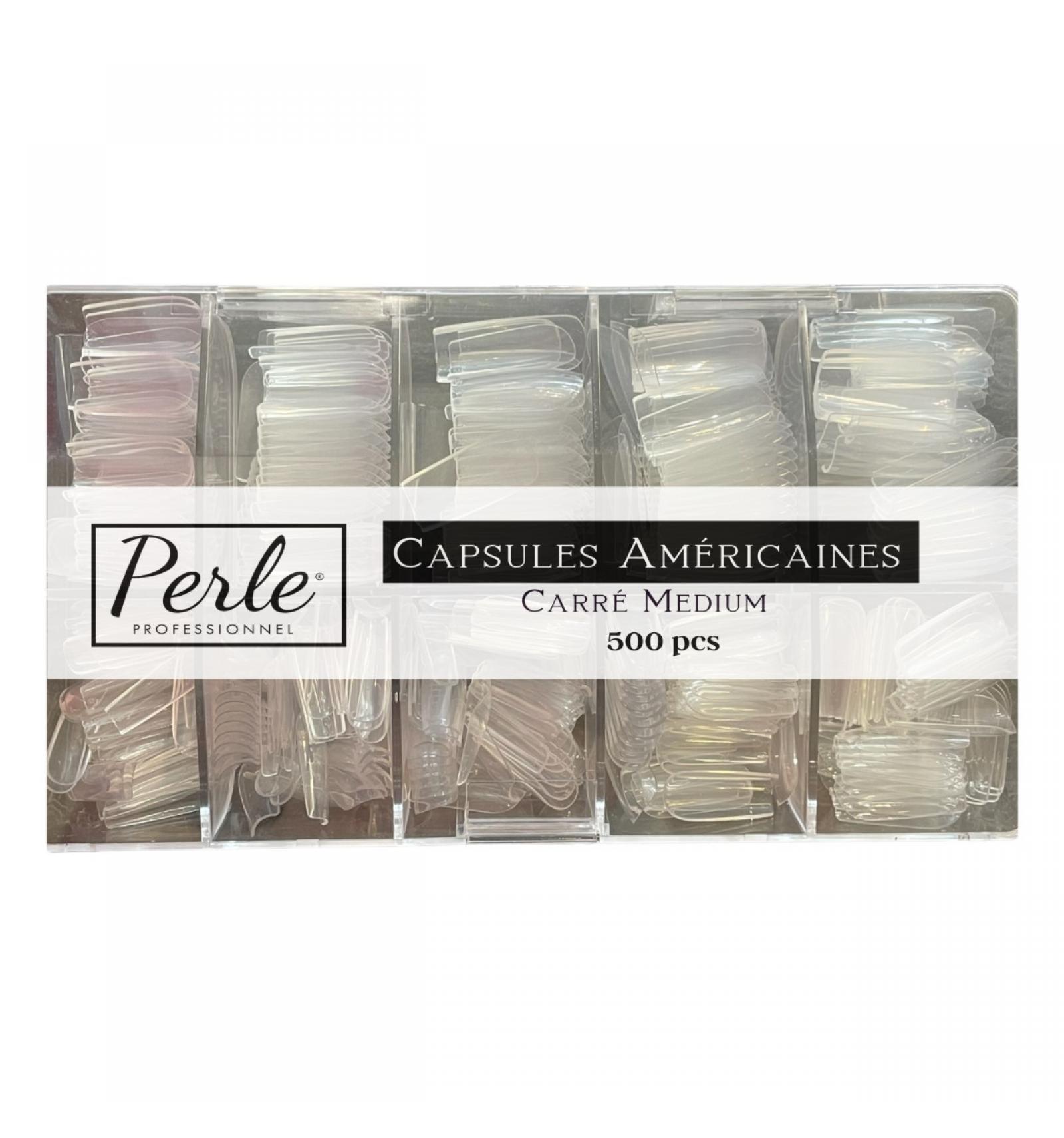 Capsules américaines carré médium Perle ProfessionnelNos capsules Américaines sont de haute qualités.Boite de 500 capsules américaines de forme carré taille médiumCapsules entières pré-forméesCouleur transparenteUltra flexibles et résistantes10 tailles disponibles , 50 pièces de chaque tailleInnovation révolutionnaire sans chablons ni construction.
